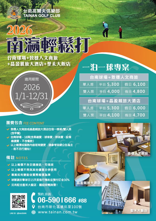 為了推廣高爾夫球運動並結合台南地區觀光資源,精心篩選優質旅宿飯店提供南灜輕鬆打之配套方案,歡迎洽詢本球場業務人員,謝謝。