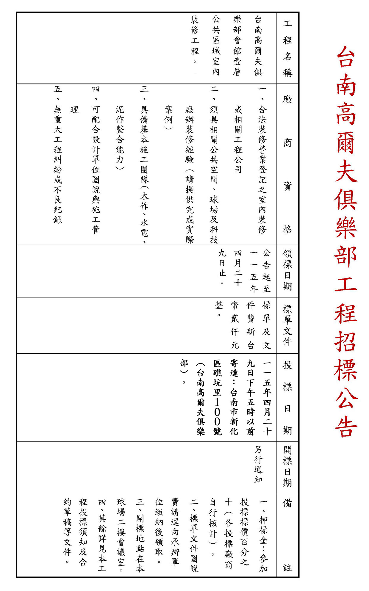 ★投標日期:115年4月29日下午五時以前寄達:712台南市新化區礁坑里100號(台南高爾夫俱樂部)