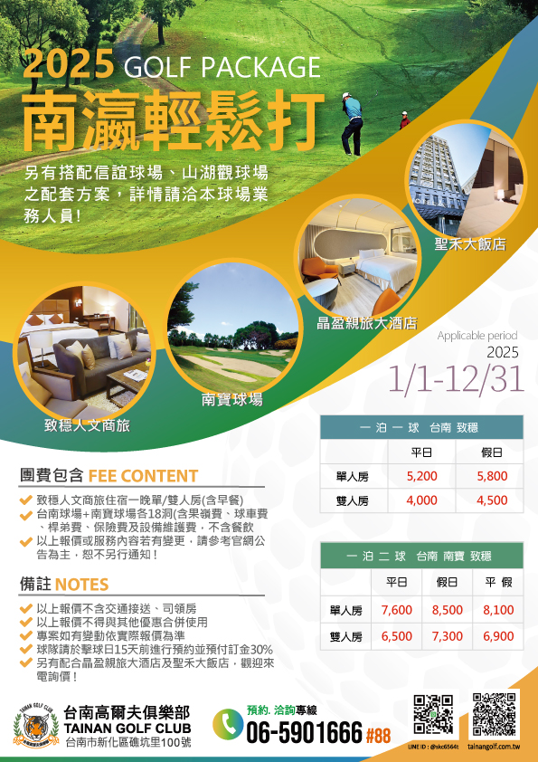 為了推廣高爾夫球運動並結合台南地區觀光資源,精心篩選優質旅宿飯店提供南灜輕鬆打套裝行程;另外還有搭配信誼球場、山湖觀球場之配套方案,歡迎洽詢本球場業務人員,謝謝。