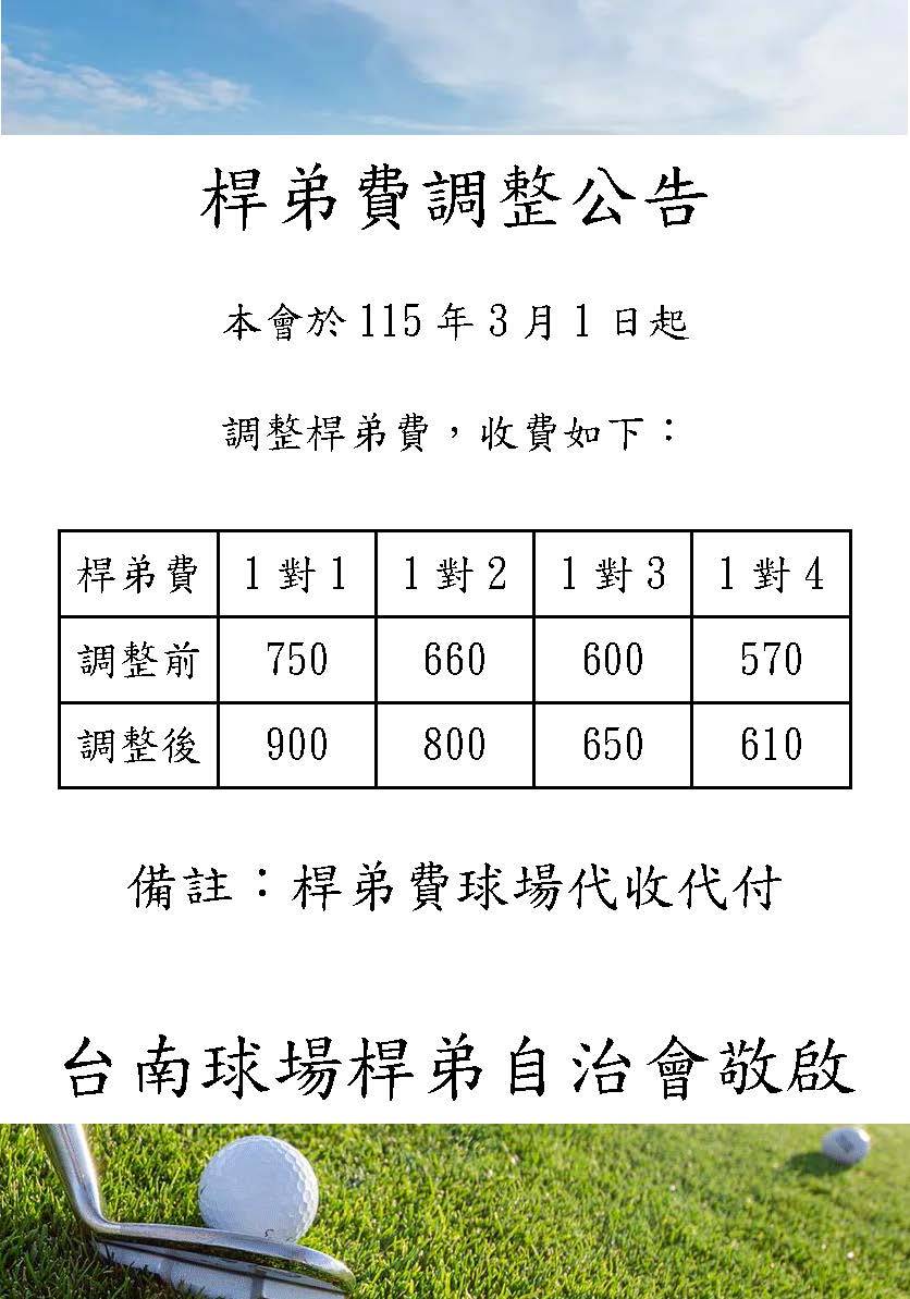 本球場桿弟費用於2026年3月1日起作調整,調整費用詳細說明如下方所示